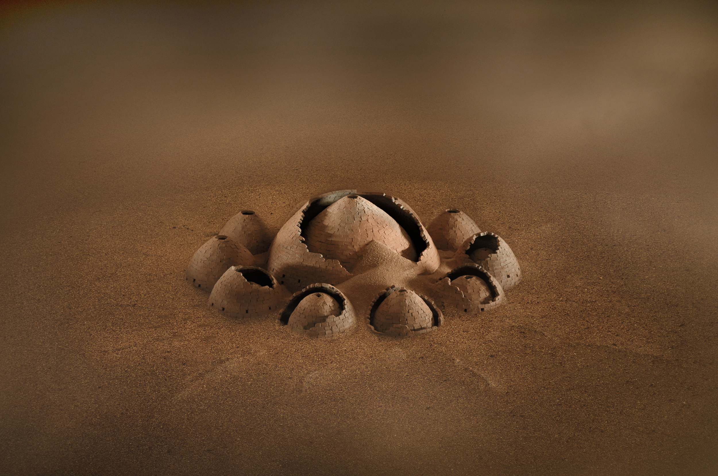After firing, the elements were assembled into models and combined with sand tinted with ochre pigment.
