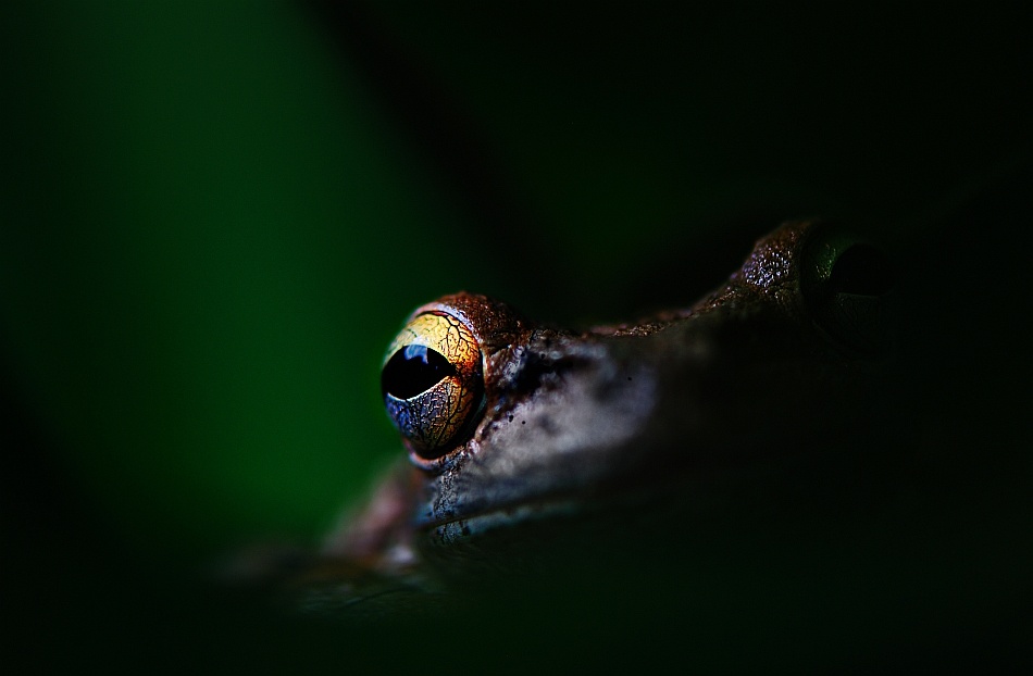 For this shot I was able to use my tripod. The first tip for a shot like this is: use a tripod where possible. A good, sturdy tripod will go a long way to obtain a great picture. Although I had previously taken dozens of photographs of tree frogs, most of them were fairly straight-forward literal representations. In the literal or documentary photograph, the Cuban Tree frog appears harmless and comical – everyone loves Kermit the frog! But the reality of the Cuban tree frog is not cute - they are destructive killers! The frog has big eyes and a huge smiling mouth that covers the face from ear to ear. The big comical eyes see extremely well at night, giving the creature the ability to see prey under the darkest conditions; the wide gash of a mouth can -- and will -- swallow just about anything that will fit inside. Thus, for this shot I did not want a literal photographic treatment: I wanted to capture the evil nature of the creature. In order to accomplish this goal, I used a large aperture that has a shallow dof. I reduced exposure compensation by -1.67 to underexpose the scene. I focused on the eye, which I wanted to isolate as the distillation the frog’s predatory nature.