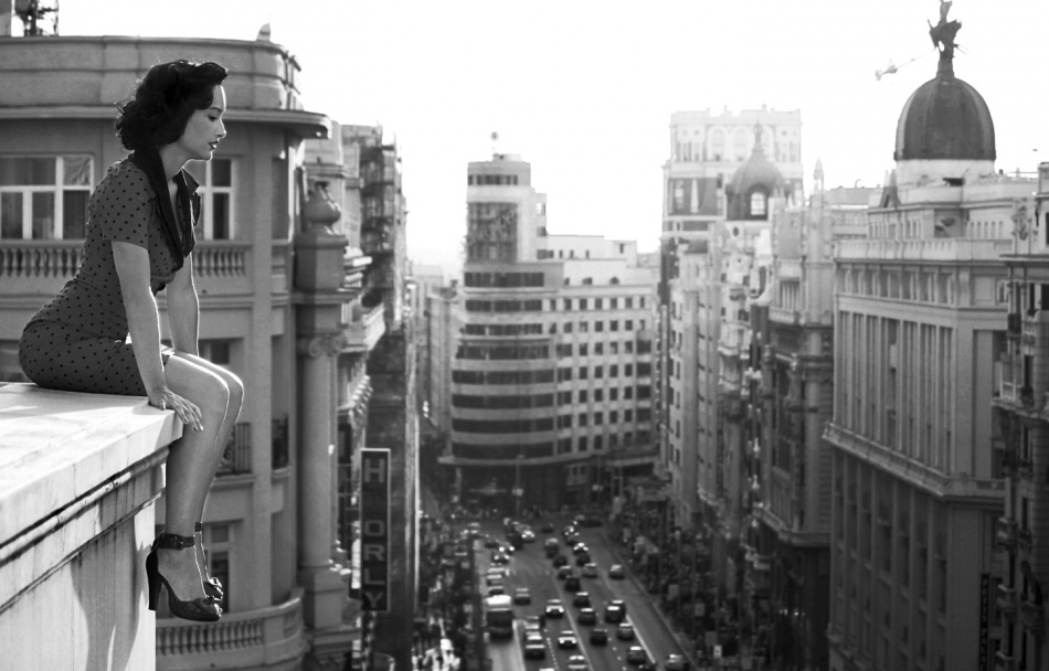 It seems to me a contradiction to showcase that in the name of the picture is emphasized., A beautiful woman who may desire to commit suicide at the height of the first buildings in the background blur and bustling city called Madrid.