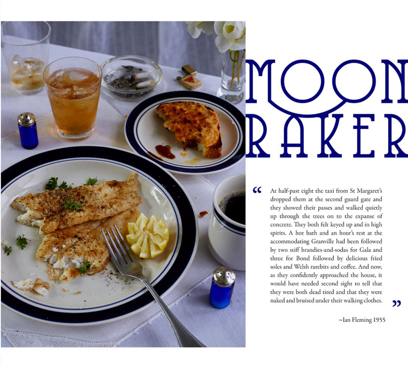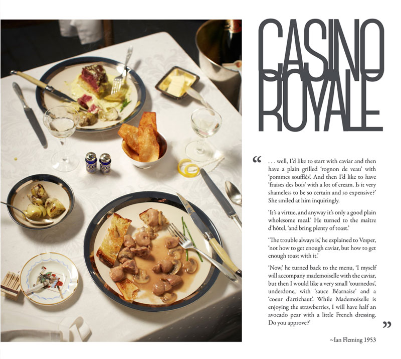 English photographer Henry Hargreaves had the inspiring idea to recreate Bond's meals in photos. He contacted food stylist Charloyye Omnés and together they meticulously brought these gourmet dinners from the page to real life. Since the books of James Bond mainly takes place during the 1950's, they had to go great lengths to find the proper attributes, such as salt strainers, glasses and cutlery.