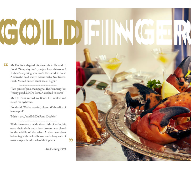 They decided to present one meal from each book. The shots were styled and lit to match the scenes from the book in which the meal takes place. To increase the sense of authenticity, they added objects that it's reasonable they could have been present during the meal. In one shot you can see Bond's trusty Ronson lighter lying on the table and in another you'll find his summer hat casually put on a stool.