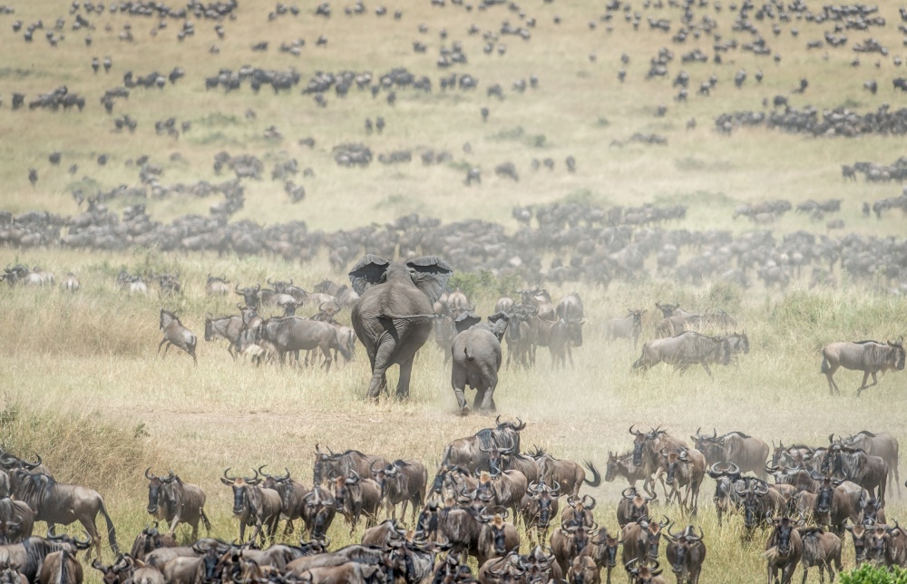 We go on safari during the “great wildebeest migration” when 1.5 million animals migrate from Tanzania up into Kenya.  This is considered the greatest wildlife show on earth.  The animals ford the rivers and fight to survive the onslaught of the Nile crocodiles and the awaiting jaws of the lion prides on the other side of the rivers.