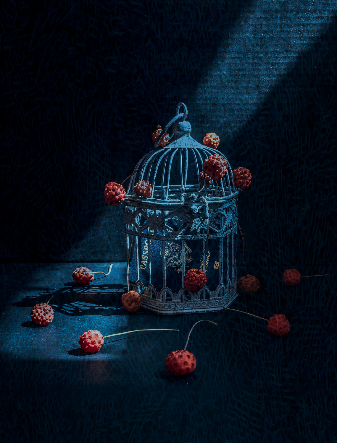 “2020”: The whole world was shut down and people were trapped by Covid-19. The passport represents human beings and the cage represents home. I placed Kousa dogwoods, which look like the coronavirus, around the cage to show how menacing and omnipresent the virus was.
