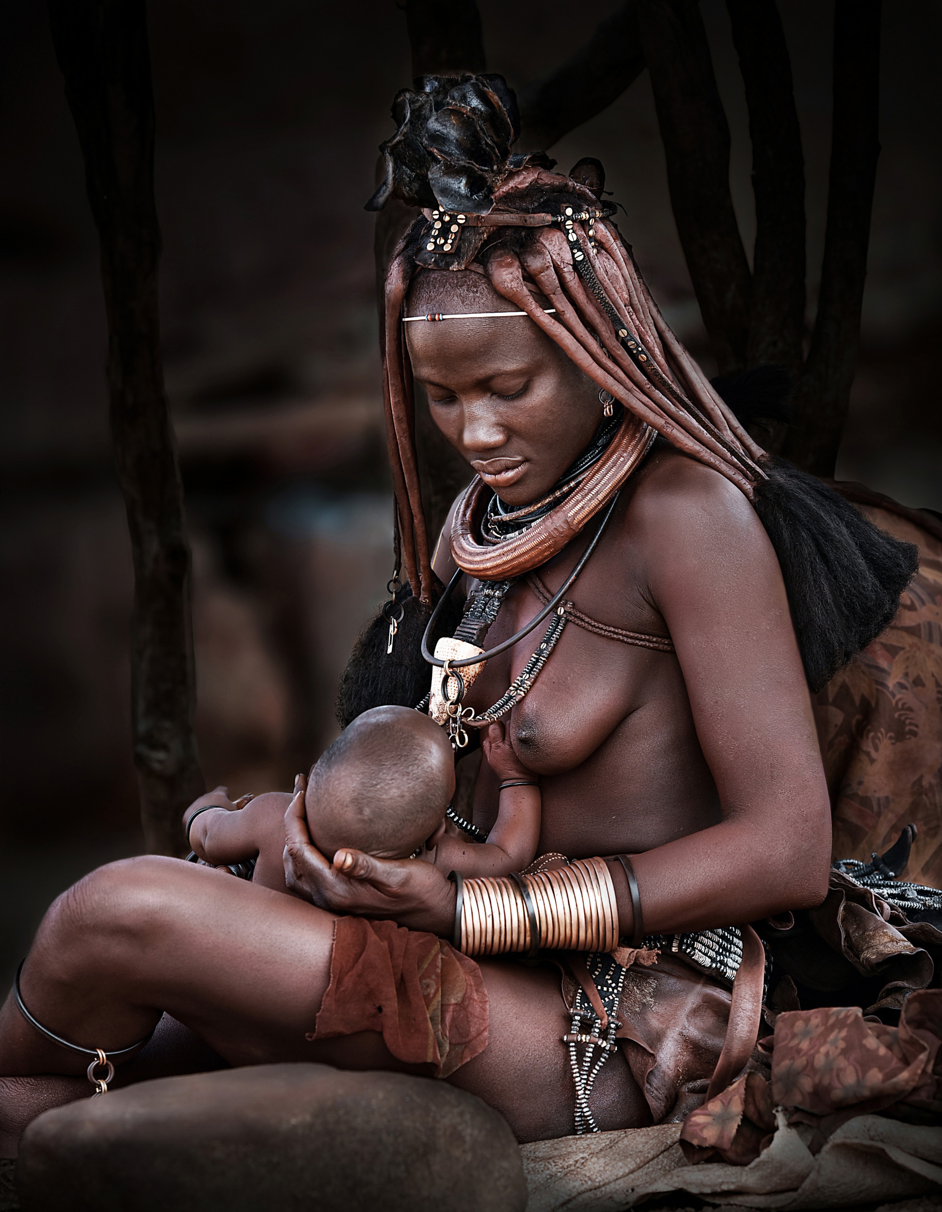 The Himba Tribes are located on the border between Namibia and Angola! Two days of arduous travel to reach those places. We brought them food and they welcomed us very warmly. Learning a few words in their language allowed us, even if is was a very little, to interact with them. It was lunchtime and they were preparing food. The woman I photographed had just finished giving a bottle of milk to her little one and was looking at him very tenderly! It was a beautiful scene. I couldn't resist to photograph it.