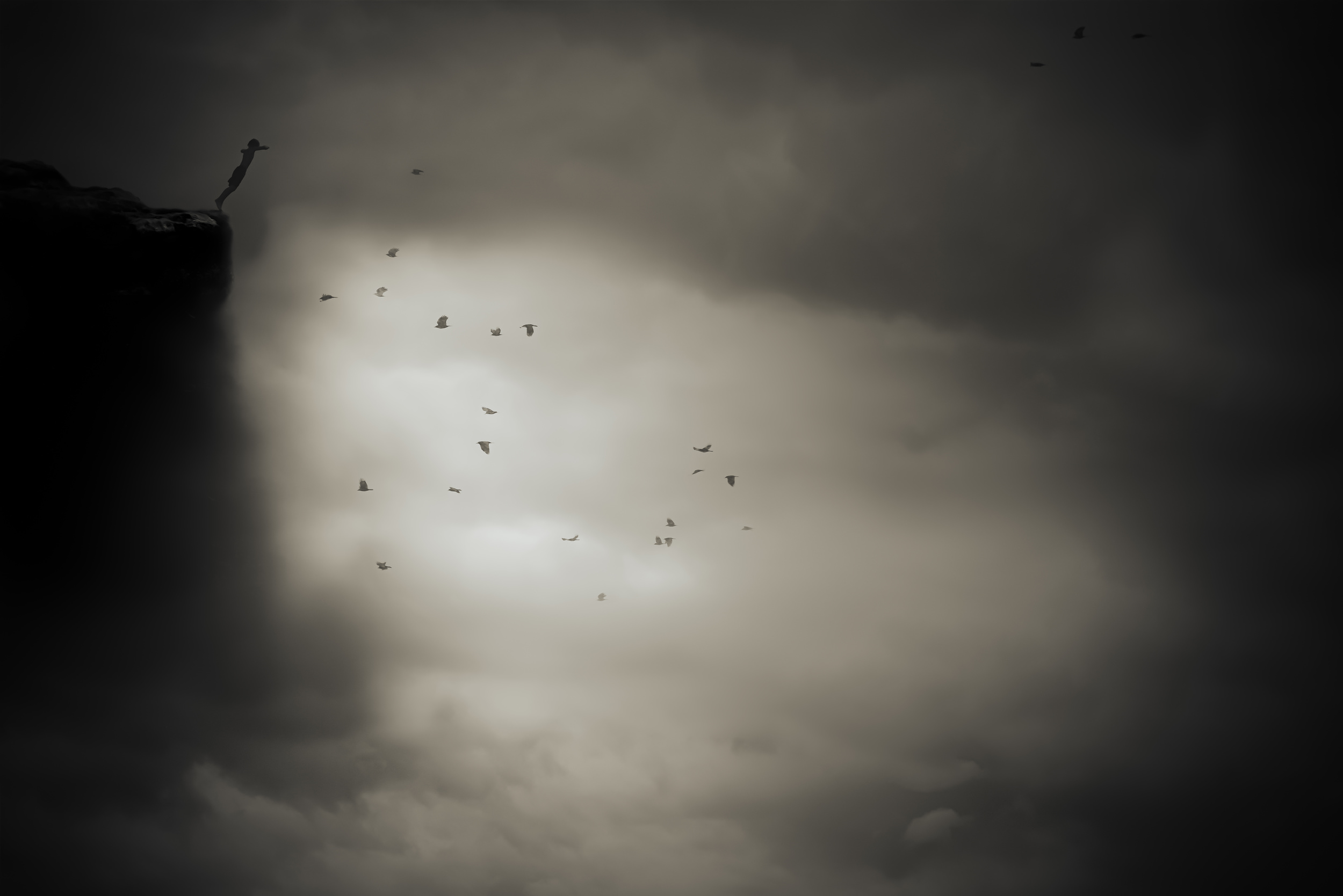 Digital image creation offers me the possibility to transform my visions into images. If I see an idea with my inner eye, I try to develop it creatively. To create emotions in my works, I like to use powerful black and white contrasts, with strong contrasts in the depiction of the size of objects and with an interesting lighting design. I often use objects such as clouds, birds, lamps and people as silhouettes, often represented very small.