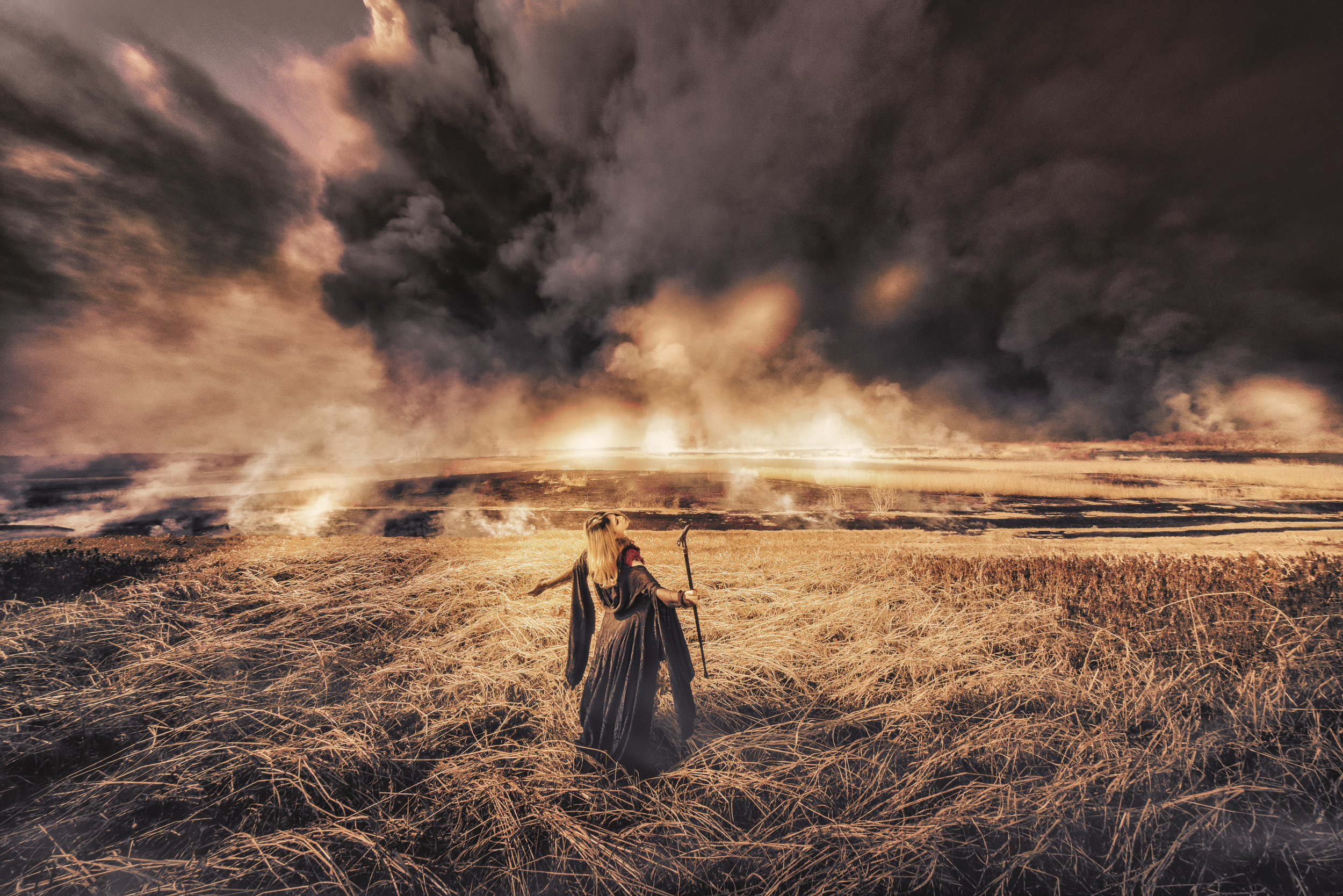 This is a Photoshop edit of a Lightroom development. The blue sky was not necessary, and the saturation was reduced. I wanted the flames to look more like luminous flames than realistic flames, so I used the glow effect to make them glow more brightly. The smoke was originally a dark gray colour, but to add depth, I partially bleach bypassed the smoke and edited it to create a faulty black colour. The entire lower half of the photo was manually processed with High Scross to create a vast three-dimensional effect of the earth.