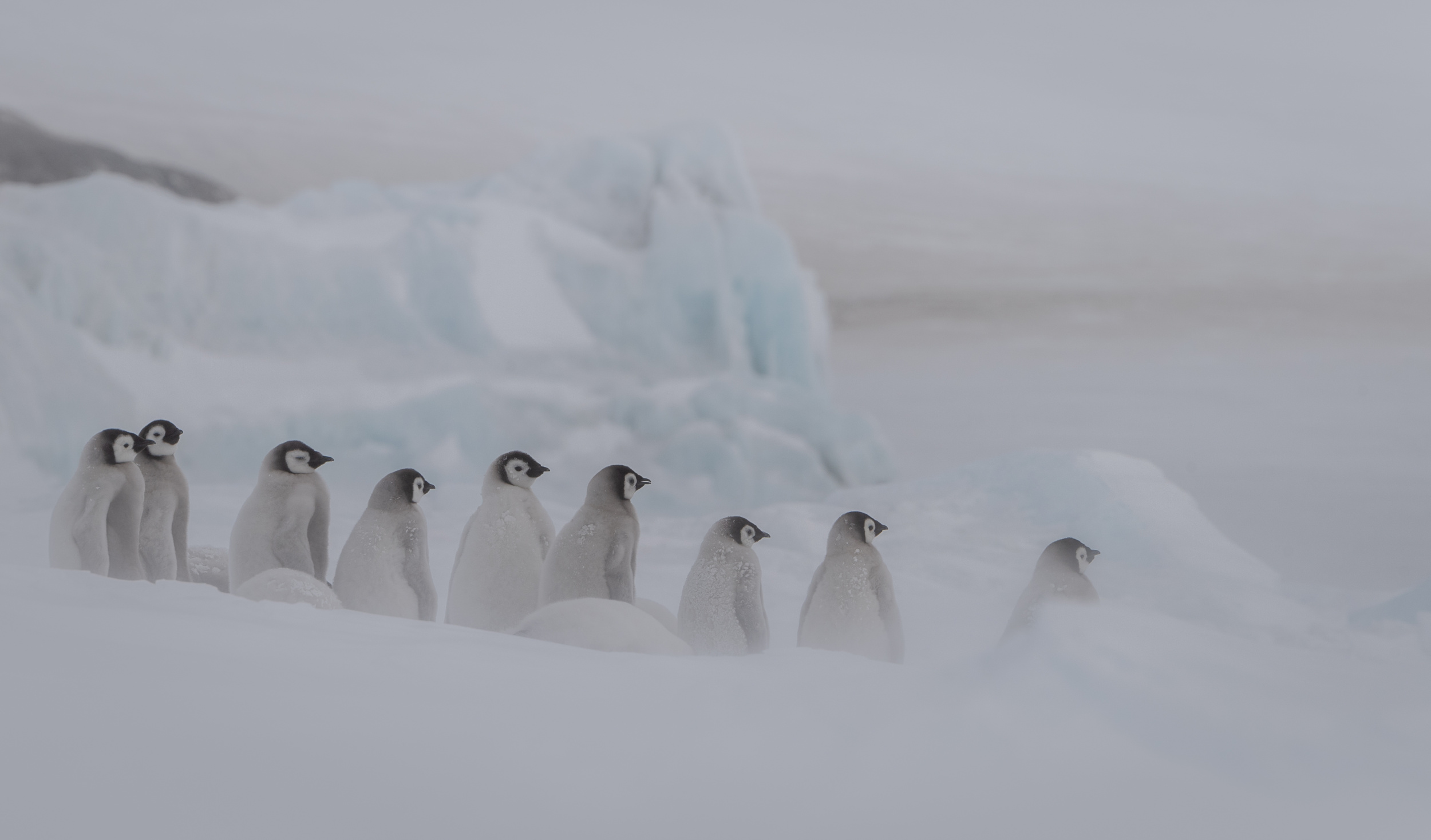 Snow Hill Island is home to up to 10,000 Emperor Penguins, making it the northernmost location on the continent where these penguins can be found. Wild Emperor penguins are only found in Antarctica. They breed and raise their young mostly on ‘fast ice’, a floating platform of frozen ocean which is connected to the land or to ice shelves. From birth, they spend their entire lives in and around the Antarctic ice, although very rarely vagrants have turned up off the coast of New Zealand. Emperors are the biggest of the 18 species of penguin found today, and one of the largest of all birds. They are approximately 120cm tall (about the height of a six year old child) and weigh in at around 40 kg, though their weight does fluctuate dramatically throughout the year. Emperors are the least common Antarctic penguin, with global population estimates of 265,500–278,500 breeding pairs. Emperor penguin colonies have been discovered and counted from space. For the last 15 years, British Antarctic Survey (BAS) scientists have been looking for new colonies by searching satellite imagery for their guano stains on the ice. There are now 66 known emperor penguin colonies around the coastline of Antarctica. Emperors incubate their eggs during the long dark southern winter months. Courtship displays are intricate but copulation is quick and the female lays a single egg in May or June. She then passes it over to her mate to incubate - and she’s off. She spends the next nine weeks at sea, feeding. The male carefully balances the egg on his feet for between 65 – 75 days to keep it warm in a specially adapted brood pouch, and off the snow surface, before it hatches. Emperors are uniquely adapted to survive these harsh conditions when temperatures can drop down to a bone chilling -50°C and with winds of up to 200km/hr. They have two layers of feathers, a good reserve of fat and proportionally smaller beaks and flippers than other penguins to prevent heat loss. Emperors also have feathers on their legs, so their ankles don’t get too chilly. Even their feet are adapted to the icy conditions, containing special fats that prevent them from freezing and strong claws for gripping the ice. But most remarkably, colonies of adults and chicks work together to huddle for warmth. 5,000 or more tightly packed adults and chicks shuffle around, so each takes a turn - but not too long - on the outside of the huddle where it’s cold. This is in complete contrast to their quarrelsome and territorial neighbours, the Adélie penguins. Their strong sense of community literally keeps them alive. Their impressive size and colour makes them extremely popular and a favourite subject for wildlife photography.
