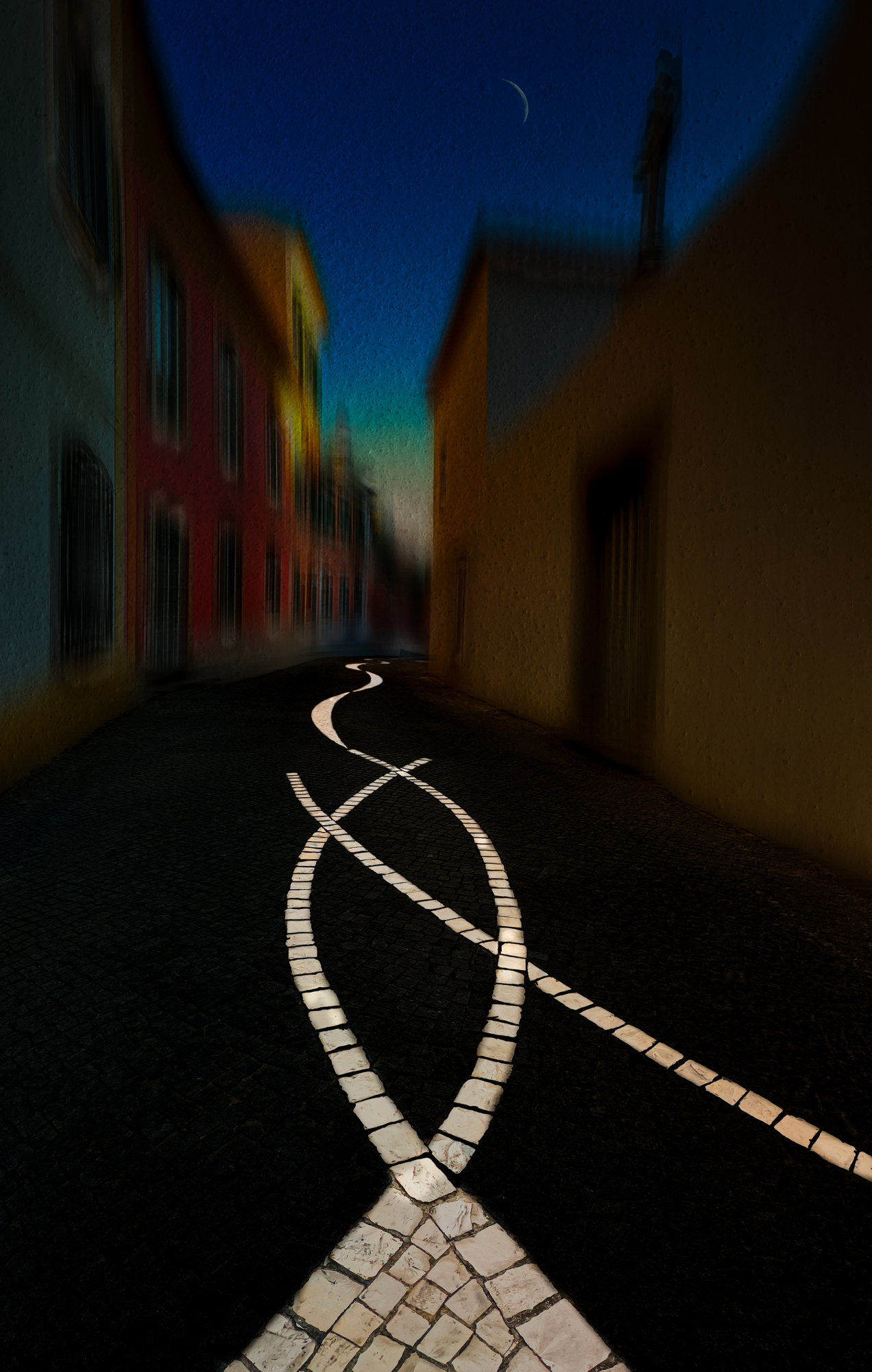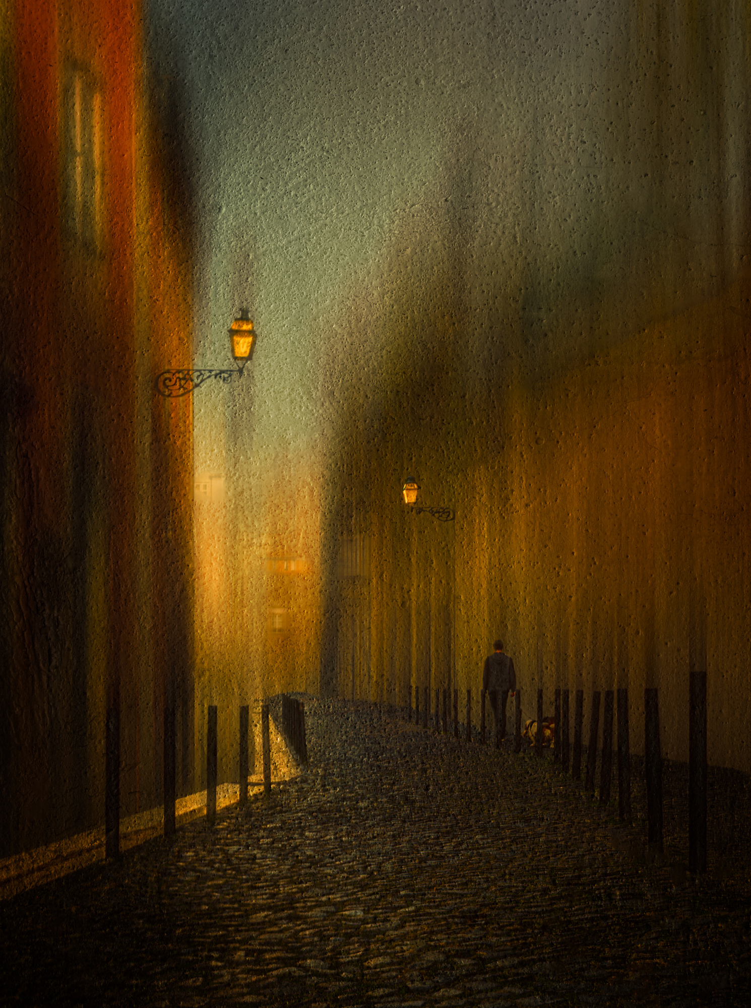 This photo was taken on a sunny day, late in the afternoon, when we were walking along a street in Porto, a little tired but emotional...suddenly I saw this beautiful and colourful street, the man walking the dog down the hill, quietly, leisurely, with the beautiful street lights, the shadows of the flowers and the sunlight on both sides of the street walls. I was touched by the scene, the peaceful moment, the light and the harmony, I had an idea of how I would process the image, so I quickly took the photo on the spot.